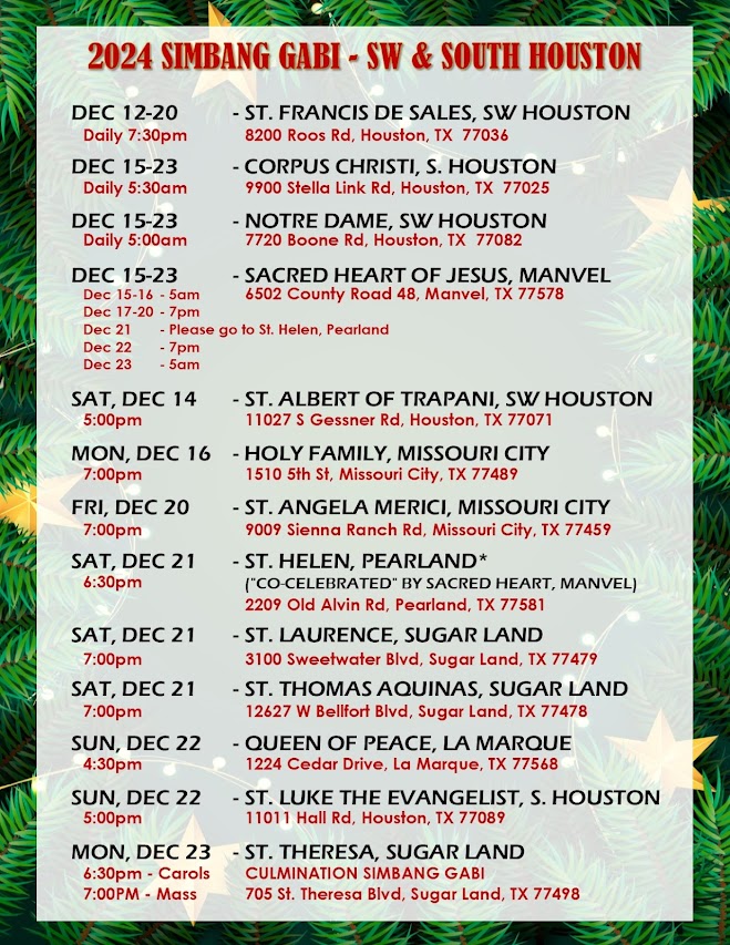 Welcome to the official site for the 2025 Simbang Gabi Schedule of the Archdiocese of Galveston-Houston. The full schedule will be posted soon—please check back for updates.